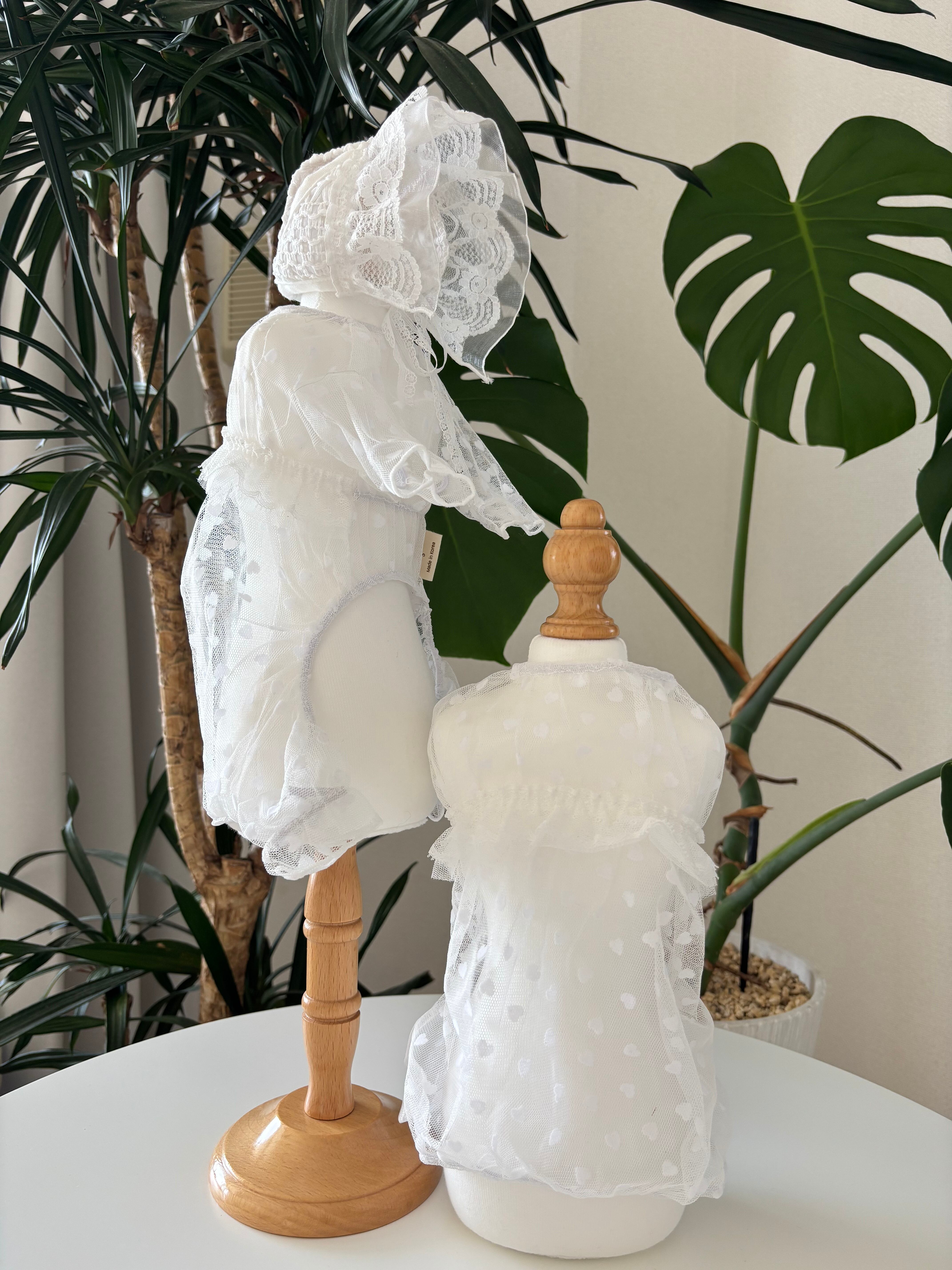 レースにチュール生地を重ねた愛らしいボンネット